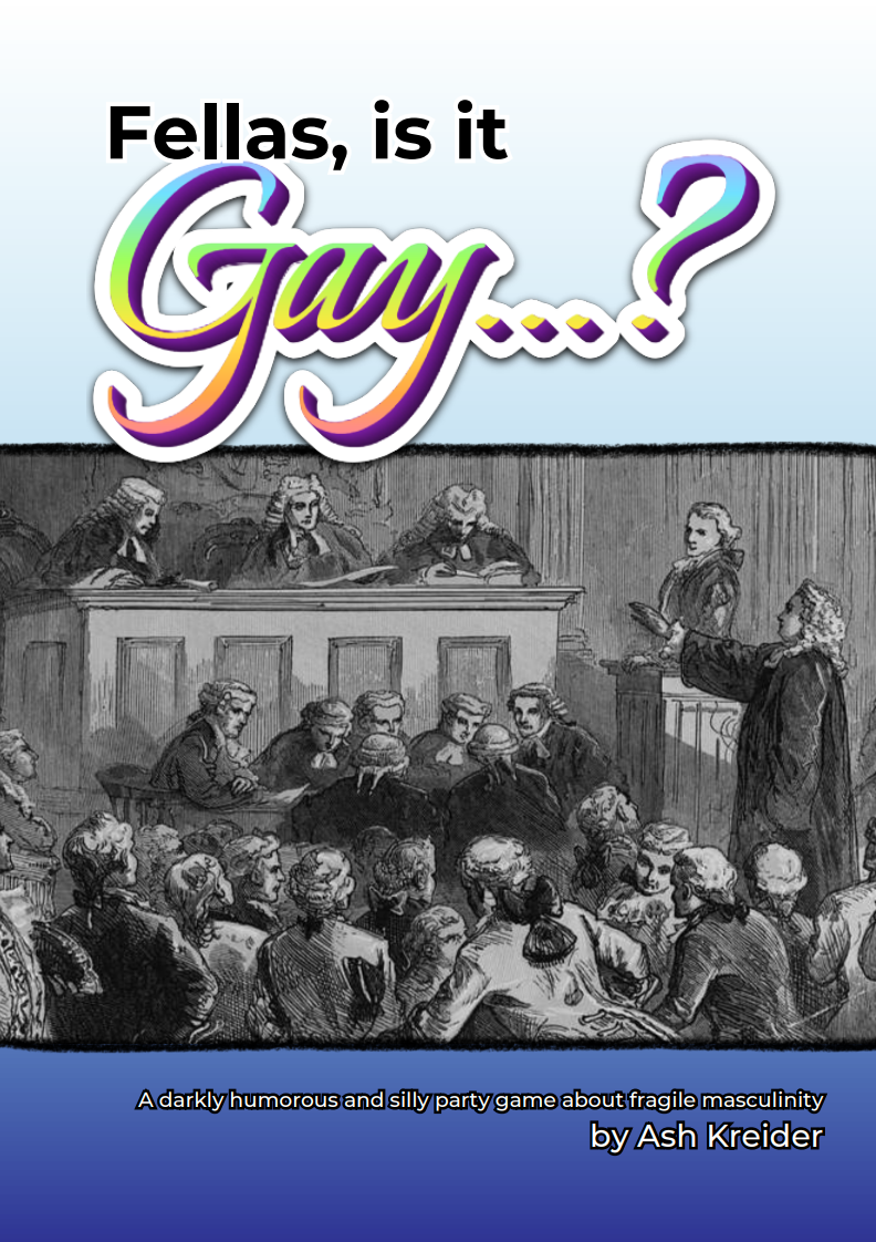 Fellas Is It Gay…? is a darkly humorous yet silly party game for 5-8 players that deals with exploring the ridiculous nature of fragile masculinity through humorous and specious arguments about what “counts” as gay, or what “makes” something gay.